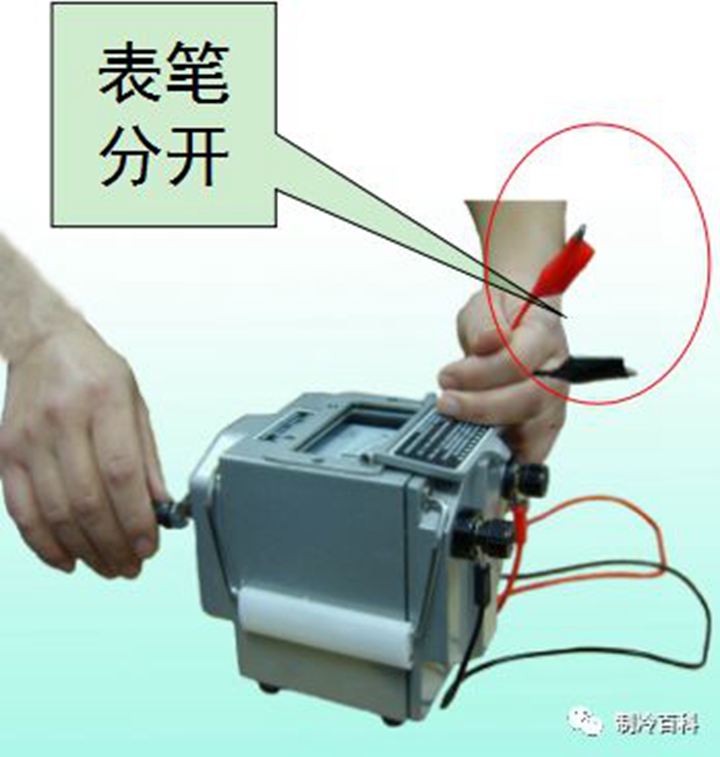 3、開路、閉路檢查。將兆歐表水平放置,在未接引線或L、E兩端子的引線處于開路狀態(tài)下,搖動搖柄,達到額定轉(zhuǎn)速(約120r/min)后,指針應(yīng)指在“∞”上;然后在表停轉(zhuǎn)的情況下,將L、E兩端的引線短接,緩慢轉(zhuǎn)動搖柄,如果表指針在”0“位,表示兆歐表正常。