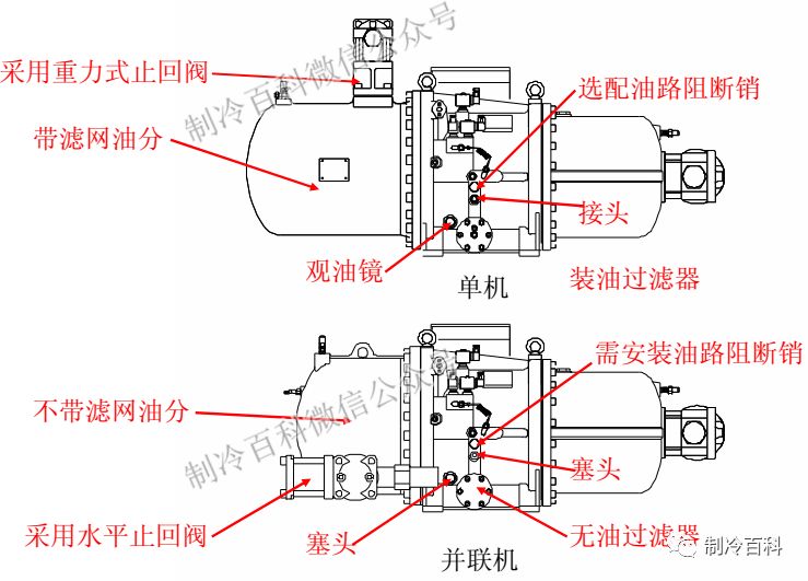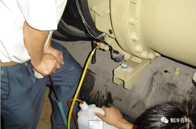 根據(jù)壓縮機結構從高壓側加油。因為壓縮機高壓和低壓腔并不直接連通,所以從低壓加油油很難回到油槽內。一般用抽真空的方式從低壓側抽空油從高壓側把油吸入。