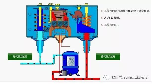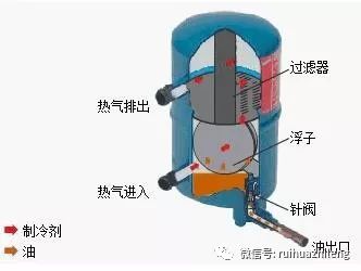 現(xiàn)在,我們將上述簡單系統(tǒng)中的部件換成實(shí)際部件:一臺(tái)壓縮機(jī)、一個(gè)冷凝器、一個(gè)毛管 和 一個(gè)蒸發(fā)器。 如下圖,這就接近于真實(shí)的制冷系統(tǒng)了。2、制冷系統(tǒng)—膨脹閥熱力膨脹閥能控制液態(tài)制冷劑從冷凝器注入蒸發(fā)器。膨脹閥能讓蒸發(fā)器出口處的過熱度保持在一定水平, 防止液態(tài)制冷劑離開蒸發(fā)器進(jìn)入壓縮機(jī)。一旦液態(tài)制冷劑進(jìn)入壓縮機(jī),便會(huì)發(fā)生液擊。必須防止這種狀況 發(fā)生,以免壓縮機(jī)損壞。Pb-感溫包壓力Pe-蒸發(fā)壓力Ps-彈簧壓力Pb = Ps+Pe, 膜片不移動(dòng)。當(dāng)感溫包壓力上升,導(dǎo)致 Pb > Ps+Pe 時(shí),膜片向下移動(dòng),閥門打開,更多制冷劑流入蒸發(fā)器。當(dāng)感溫包壓力下降,導(dǎo)致 Pb < Ps+Pe 時(shí),膜片向上移動(dòng),閥門關(guān)閉,流入蒸發(fā)器的制冷劑減少。3、制冷系統(tǒng)—儲(chǔ)液器在高壓條件下,壓縮后的制冷劑蒸氣在冷凝器中凝結(jié)為液體制冷劑。離開冷凝器后,液體流經(jīng)儲(chǔ)液器。儲(chǔ)液器主要有兩個(gè)功能。 1、儲(chǔ)液器對負(fù)荷變化造成的冷凝器液位變化進(jìn)行補(bǔ)償。當(dāng)膨脹閥打開/關(guān)閉時(shí),冷凝器的液位會(huì)發(fā)生改變,若儲(chǔ)液器中沒有“額外”的制冷劑,膨脹閥前端的液體量就可能不足,致使膨脹閥無法正常工作,造成整個(gè)系統(tǒng)變得不穩(wěn)定。2、儲(chǔ)液器還作為一個(gè)額外的容器,幫助液態(tài)制冷劑與制冷劑蒸氣分離,確保離開儲(chǔ)液器的是純液態(tài)制冷劑。4、制冷系統(tǒng)—電磁閥電磁閥是一種利用電磁力的閥門。它是一種開/關(guān)閥,根據(jù)通斷電情況控制制冷劑的流動(dòng)。電磁閥大致可分為兩類。直動(dòng)式電磁閥 – 閥線圈通電時(shí),電磁閥直接打開/關(guān)閉閥口。伺服式電磁閥 – 通電或斷電時(shí),閥門打開引導(dǎo)閥口,讓主閥口根據(jù)膜片/活塞的壓差逐漸開(取決于閥門是 NC 還是 NO)。這兩種電磁閥又各自分為:NC(常閉型)不通電時(shí)限制制冷劑流動(dòng)(平常關(guān)閉),閥線圈通電時(shí)允許制冷劑流動(dòng)。NO(常開型)不通電時(shí)允許制冷劑流動(dòng)(平常打開),閥線圈通電時(shí)限制制冷劑流動(dòng)。工作原理:冷藏室溫度上升時(shí),感溫包壓力上升到設(shè)定值,電源端子 1 和 4 接通,從而打開電磁閥,允許制冷劑流入蒸發(fā)器。溫度下降時(shí), 感溫包內(nèi)的壓力下降到設(shè)定值。端子 1 和 4 斷開,子 1 和 2 接通。電磁閥斷電并關(guān)閉,因而限制制冷劑流向蒸發(fā)器,使冷藏室溫度上升。5、制冷系統(tǒng)—壓力控制器若電磁閥阻止制冷劑流向蒸發(fā)器,而壓縮機(jī)仍在運(yùn)轉(zhuǎn),這時(shí)會(huì)發(fā)生什么情況?進(jìn)氣壓力下降。為此我們需要停止壓縮機(jī),以便控 制系統(tǒng)壓力,防止進(jìn)氣壓力降到標(biāo)定壓力之下。此外,若由于冷凝器太臟或風(fēng)扇故障導(dǎo)致冷凝壓力升得過高,也必須停止壓縮機(jī), 以防壓縮機(jī)超出工作范圍。壓力控制器能防止進(jìn)氣壓力(蒸發(fā)器壓力)過低或排氣壓力(冷 凝器壓力)過高,以此控制和保護(hù)系統(tǒng)。壓力控制器主要有兩個(gè)功能:保護(hù)(或安全)功能: 限制壓力,系統(tǒng)壓力過低或過高時(shí)切 斷電源。控制功能 壓縮機(jī)循環(huán)、風(fēng)扇循環(huán)和排空。常見的壓力控制器有兩種:單壓控制器: 分為低壓控制器和高壓控制器。雙壓控制器:一個(gè)控制器兼具低壓控制和高壓控制。壓縮機(jī)高低壓保護(hù):壓縮機(jī)常常需要保護(hù),以防止冷凝壓力過高或者進(jìn)氣壓力過低。實(shí)現(xiàn)的方法是使用兩個(gè)單壓開關(guān)或者一個(gè)雙壓開關(guān)。開關(guān)有多種 電氣接觸類型。這里看到的是一個(gè)簡單的類型。高壓和低壓開關(guān)組合在一個(gè)殼體內(nèi)。兩個(gè)球體作用于兩者之間的裝置。若壓力達(dá) 到“高”設(shè)定值,開關(guān)將打開觸點(diǎn)A 和 C。若壓力落到“低”設(shè)定值以下,開關(guān)也會(huì)打開觸點(diǎn) A 和 C。6、制冷系統(tǒng)—油分離器壓縮機(jī)排放的制冷劑熱氣將帶走壓縮機(jī)內(nèi)的油。有時(shí)候量太大,帶走的油不再回到壓縮機(jī)。為了防止這種狀況,我們用油分離器將制冷劑中的油分離出來,使之回到壓縮機(jī)。油分離器的作用: 1、油分離器的作用是將熱氣中的油分離出來,并通過自帶的控制 裝置讓油回到壓縮機(jī)的集油槽。2、油分離器可防止油量不足,對壓縮機(jī)具有保護(hù)作用。3、油分離器可防止油積聚在礙事之處并降低效率,因而對制冷系 統(tǒng)具有保護(hù)作用。油分離器的功能:1、 把油從排放的制冷劑氣體中分離出來。2、過濾器可防止油逸入制冷系統(tǒng)。3、 將油收集到分離器底部。 4、油位升高時(shí),浮子打開一個(gè)針閥,讓油回到壓縮機(jī)集油槽。5、油位下降時(shí),浮子向下移動(dòng)并關(guān)閉針閥。7、制冷系統(tǒng)—干燥過濾器作用:制冷系統(tǒng)內(nèi)可能存在其他異物,例如水、金屬氧化物和污垢,它們會(huì)降低系統(tǒng)的工作效率或者令系統(tǒng)停止工作。我們用干燥過濾器清除制冷劑中的這些異物,確保系統(tǒng)更有效地工作。干燥過濾器的作